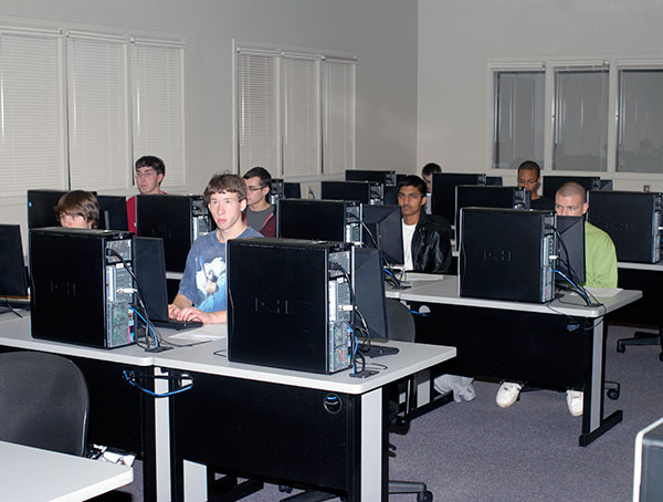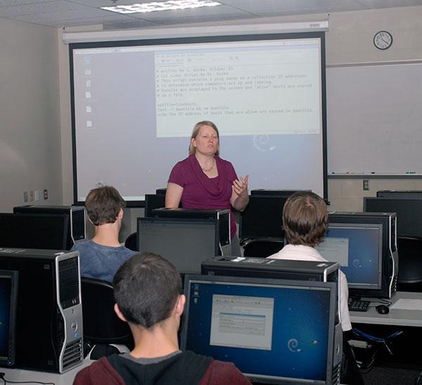The Information Technology Living-Learning Community, among the more active academic-themed housing clusters within Penn College's Residence Life Office, gained insight into scriptwriting for the Linux operating system Tuesday. The group regularly holds recreational and instructional get-togethers in a variety of locations on and off campus, and gathered in a Breuder Advanced Technology and Health Sciences Center computer lab for the afternoon session. Sandra Gorka, an associate professor of computer science in the School of Business and Computer Technologies – and one of the faculty members who generously share their expertise with the residential IT group's members – walked the students through the process of writing scripts to automatically accomplish prescribed tasks.