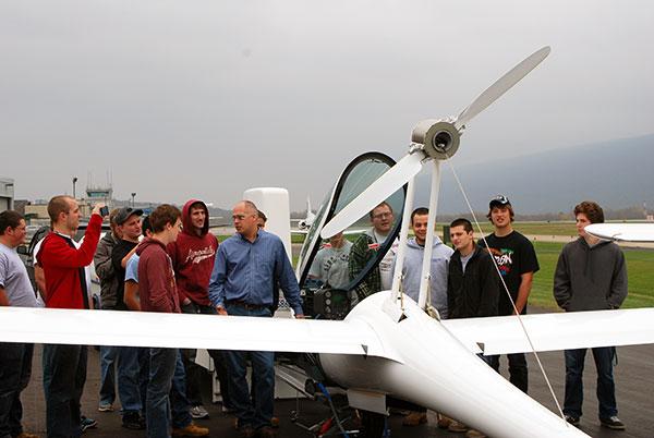 To inspire electricity students, aviation instructor Michael R. Robison brought an electrically powered aircraft to Penn College's Lumley Aviation Center on Friday. The Lange Antares 20E is one of six flying in the United States. The 42-kilowatt motor can lift the aircraft to nearly 10,000 feet. Once at altitude, the motor and propeller automatically retract, and the aircraft soars with a 55:1 glide ratio. That means the aircraft can glide approximately 100 miles after the motor has lifted the aircraft to maximum altitude. The plane is equipped with electronic flight instrumentation, communication and collision avoidance equipment. Robison demonstrated the motor, deployment mechanism, retraction mechanism and flight controls before taking off. Because the aircraft is nearly silent, the students could hear the tower call Robison to confirm he was able to depart under his own power. After making a few circuits of the Williamsport Regional Airport traffic pattern, he landed and returned to the Aviation Center. To save weight, the aircraft is equipped with a single, large retractable landing wheel. Small wheels on the wingtips prevent them from scraping the runway.Photos by Thomas D. Inman, associate professor of aviation