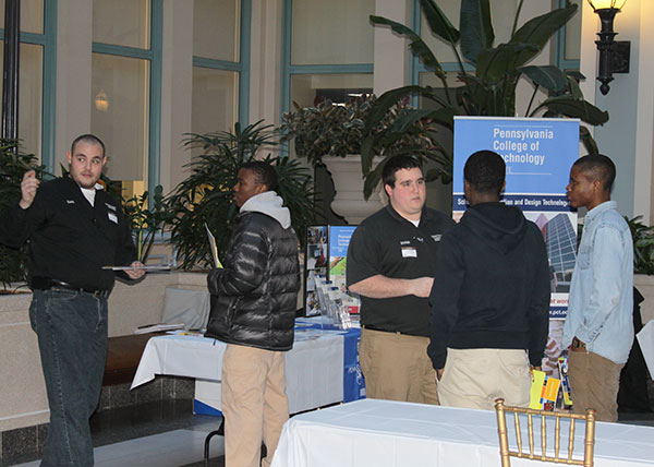 In their ongoing efforts to attract students to Penn College's four-year construction management major, seniors Benjamin J. Stover (left) and David S. Price attended the ACE Mentor Program’s College Fair held Tuesday afternoon at the John Wanamaker Building in Philadelphia. Baker, of Stroudsburg, and Stover, of Hershey, are helping to recruit students as part of their capstone project in the School of Construction and Design Technologies. While many student prospects are aware of potential careers in such fields as architecture and engineering, fewer are familiar with construction managers' vital part in shepherding building projects into reality. Instructor Brad Martin, who also provided the photo, joined the students in spreading the word about the college’s nationally accredited program.