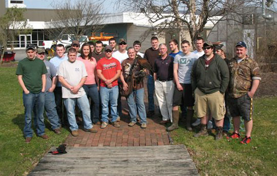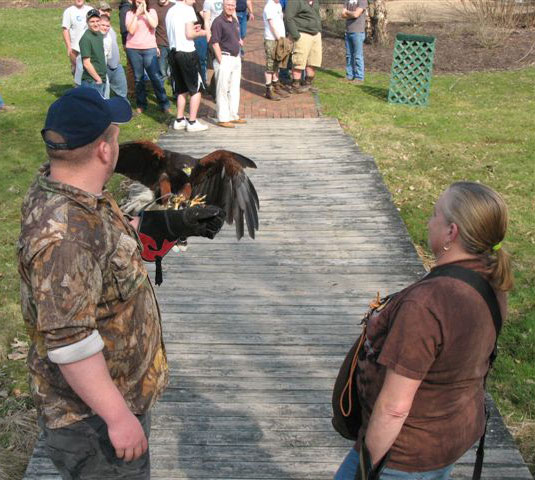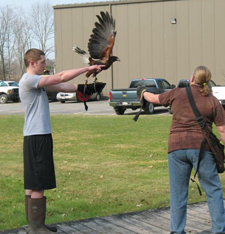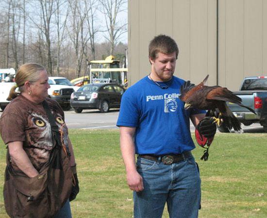 Master Falconer Cheri Heimbach returned to Penn College's Schneebeli Earth Science Center on Wednesday, introducing students in instructor Jack E. Fisher's Wildlife Management class to varied birds of prey. "I believe in the education of young people, as they are our future," said Heimbach, one of about 150 falconers in Pennsylvania. "This is a 4,000-year-old hunting technique and I enjoy passing along my passion, as well as demonstrating this ancient sport." She brought along Alice, a 5-year-old Harris's Hawk; a Gyrfalcon, Peregrine Falcon and American Kestrel. "I've never had a hawk on my arm before!" noted Wade S. Truitt, a forest technology student from McAlisterville. "I was surprised how heavy those two pounds felt; this was certainly a new and different experience."Photos by Carol A. Lugg, coordinator of matriculation and retention, School of Natural Resources Management