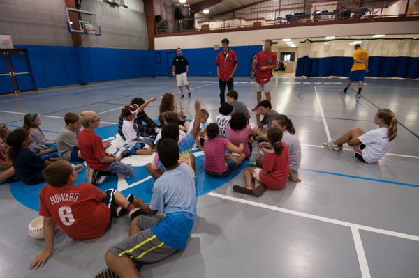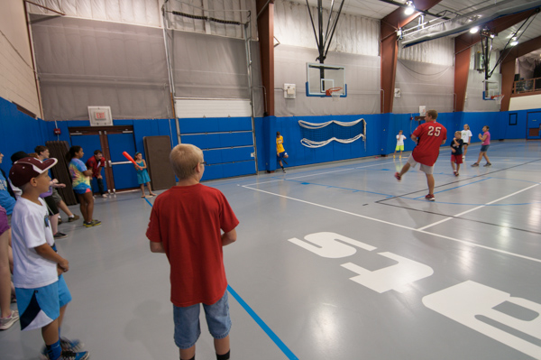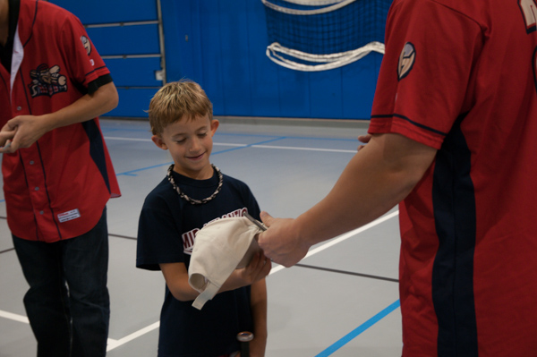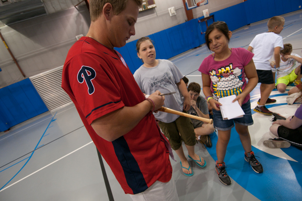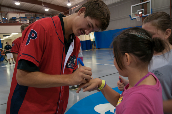 Performing community outreach before they suited up for an evening game against the Brooklyn (N.Y.) Cyclones, two members of the Williamsport Crosscutters − pitcher Drew Anderson and infielder Logan Pierce − visited Penn College’s Camp ESCAPE on Thursday. The players signed a number of campers' belongings, both expected (balls and bats) and random (T-shirts, arms, bookbags ... even a "base-bowl"), before captaining a spirited whiffle-ball game in the Field House.