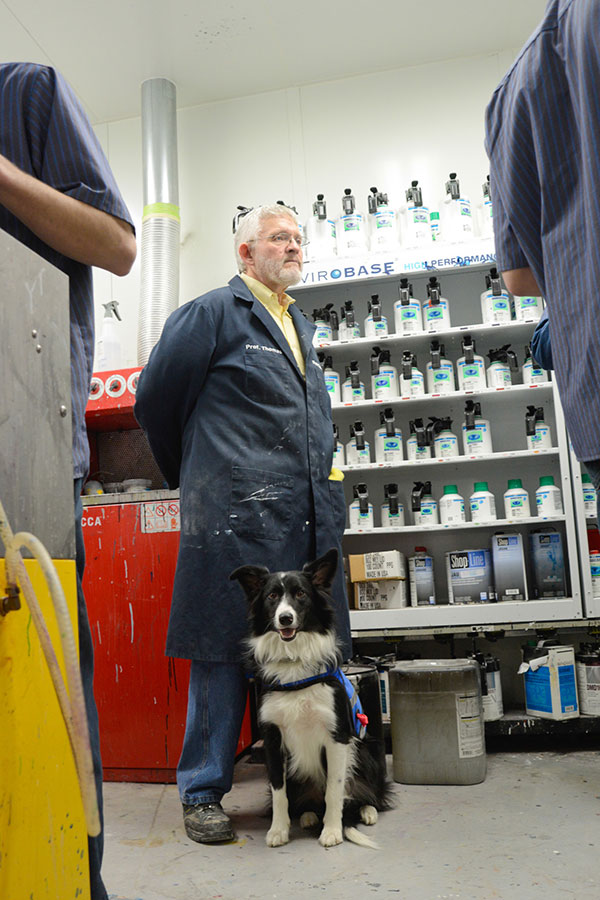 “Jesse” (his full name is Jesse James, of Wild West fame) is the service dog of Alfred M. Thomas II, associate professor of collision repair. Following a diagnosis of post-traumatic stress disorder and certification through the Veterans Administration, Thomas obtained approval to have Jesse with him at work via the Americans with Disabilities Act. The young border collie arrived on the scene last year.