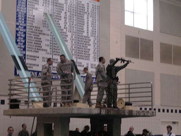 ROTC cadets from Bison Battalion, which includes Penn College and four other institutions, gathered during Bucknell University's recent Parents Weekend to conduct Combat Water Survival Training. The training is relatively short, but intensive, and is meant to measure cadets' overall ability to swim and perform various tasks in an aquatic environment. Cadets are required to swim continuously for 10 minutes during the exercise, followed by five minutes of treading water. They then must complete a 25-meter equipment swim wearing load-bearing equipment while holding a “dummy” rifle out of the water. Following the equipment swim, cadets rotate to the three-meter equipment jump, which consists of cadets wearing load-bearing equipment, masks over their faces and again holding “dummy” rifles. They are pushed off the three-meter diving board, then swim back to the edge of the pool while holding onto their equipment. (Parents of Bucknell cadets were allowed to push their sons and daughters off the high dive.) The last test for cadets was the equipment ditch, which consists of a cadet's fall backward into the pool with the same equipment as before. and. while submerged, removing all the equipment from his or her body. Successful completion of Combat Water Survival Training is a requirement for all cadets prior to attending the Leadership Development Assessment Course between their junior and senior years.Photos provided by Cadet Michael Embs, public affairs officer, Bison Battalion
