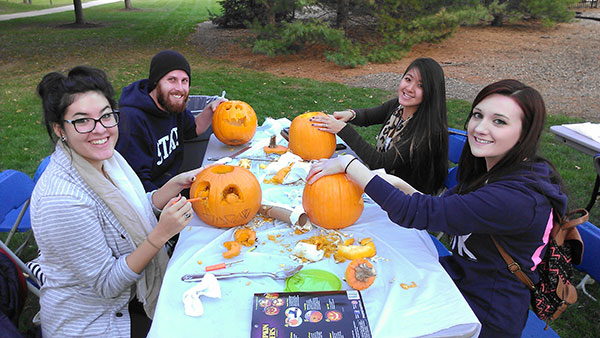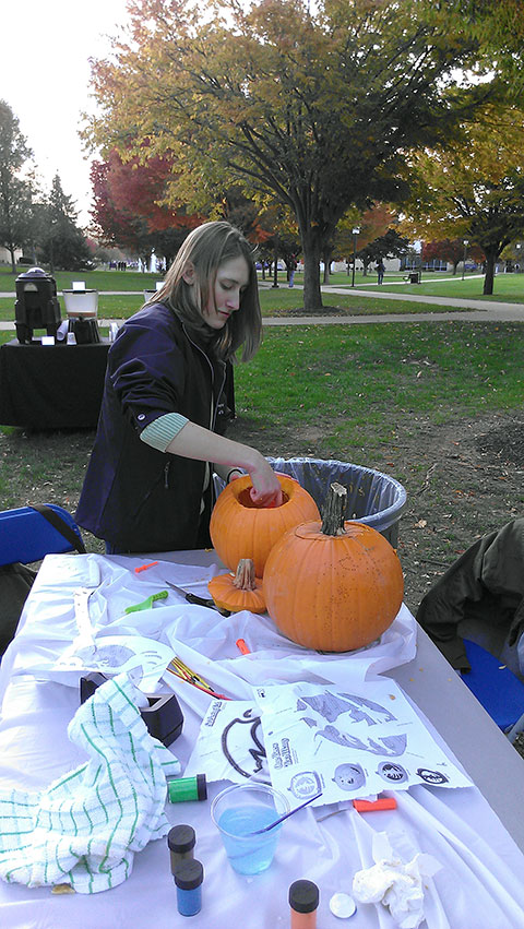 Commuter Assistants Cheston T. McAninch and Lauren J. Crouse hosted a pumpkin-carving and -painting program at the campus rock Tuesday. More than 55 students enjoyed hot apple cider and pumpkin pie as they carved or painted in the well-organized Halloween Week event. Several students donated their creative pumpkins to The Village Apartments in preparation for the traditional Trick or Treat night from 6-8 p.m. Wednesday.Photos by Katie L. Mackey, coordinator of off-campus living and commuter services