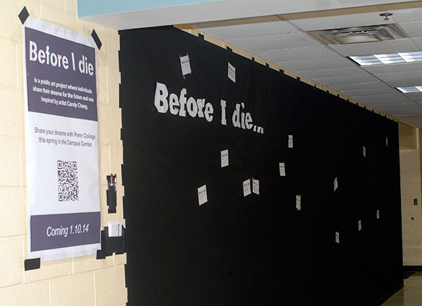 Members of the Penn College community are encouraged to participate in Before I Die, a public art project inspired by the work of Candy Chang. Participants complete the sentence, "Before I die, I want to ..." on a white postcard and hang it in the Bush Campus Center's north hallway for public viewing. The campaign encourages individuals to reflect on what really matters to them, as opposed to the day-to-day routine that easily distracts. The project, the subject of a TED Talk by the artist, will be on display until Friday, Jan. 17.