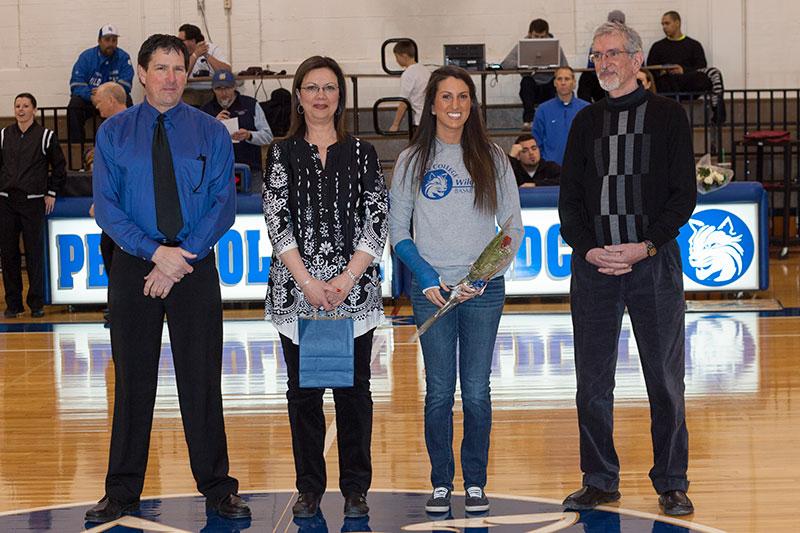 On Saturday, the Penn College women’s basketball team honored lone senior Alison K. Van Metter prior to the start of its game against Penn State Hazleton. Van Metter, an occupational therapy assistant major from Saylorsburg, is a three-year member of the squad and team captain for the past two. Off the court, Van Metter is a prominent member of the Student Athlete Advisory Committee, helping to run community-service projects and fundraisers, is a member of the Occupational Therapy Assistant Club and serves as a Presidential Student Ambassador. She is also a standout academically, having been named to the Penn State University Athletic Conference All-Academic team. After graduation, Van Metter plans to attend graduate school for occupational therapy and then begin a career as an occupational therapist in a pediatric cancer unit or pediatric prosthetics center.Photos by Craig R. Urey, student photographer
