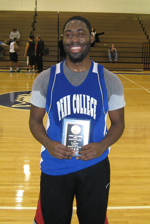 "The only thing colder than students' shooting is the Polar Vortex," intramural assistant Jeremy R. Bottorf quipped, recapping the team's performance during Thursday's renewed rivalry with its staff/faculty challengers. The employee squad scored the game's first eight points, and the student team – which could not overcome that cold shooting – soon found itself down by double digits. The students were not about to give up, however, calling a timeout with eight minutes left in the first half and the staff/faculty team up 27-9. Whatever was said in the huddle worked, as students began clawing their way back into the game and soon whittled the employees' lead to nine. The staff/faculty team took back the momentum, hitting some big shots to regain a double-digit lead, but Alphonso Kelly hit a trio of 3-pointers and the students once again were down by only nine points at halftime. Kelly continued to shine in the second half, finishing as the students' high scorer with 30 points and Most Valuable Player honors. Unfortunately, his teammates had issues with their shots and struggled to make baskets down the stretch. Mike Striefsky scored 15 for the students and Azeez Sulaimon added 13 points, but it wasn’t enough: the students drew no closer than seven in the second half and ultimately fell, 89-69. Joe Simon, who started off with a 3-pointer and connected on numerous other shots, ended with a team-high 28 points for the staff/faculty. Tom Little added 26 and Clayton King chipped in with 18. The rest of the winners' scoring came from Shawn McGehean, nine; Gallahad Mallery, five; and Dale Jaenke, two. Chris Lemasters added a point before leaving the game with a sore knee. The rest of the student scoring came from Hernael Noel, five; and Gio Valdez, Gabriel Nepita-Mejia and Jason Stewart, each with two. Stewart fouled out of the game and tried (unsuccessfully) to don a staff/faculty team jersey to get back onto the court. The next staff/faculty vs. student event will be a volleyball game at 5 p.m. Wednesday, April 9, in Bardo Gym.Photos by Jeremy R. Bottorf