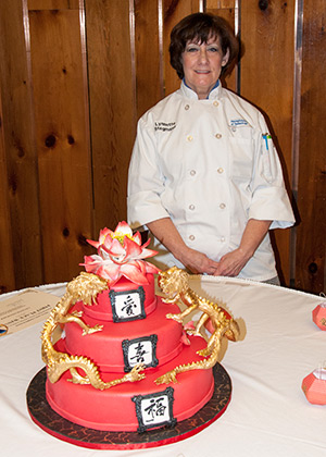Lynnette F. Stegmaier, of Muncy Valley, was awarded first place in the “Destination Wedding”-themed contest. Her red fondant-covered cake represents a Chinese wedding and features hand-formed gum-paste dragons, a lotus topper, and good wishes for the couple, hand-painted in Chinese script.