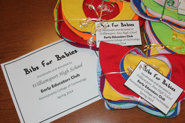 Through a "Bibs for Babies" project, three members of Penn College's Early Educators Club delivered handmade bibs and burp cloths to a parenting class at Williamsport Area High School. Accepting the bibs on behalf of the class, which is offered through Susquehanna Health, was high school student Elizabeth Kilburn. From left in accompanying photo are Katlynn M. Peck, of Thompsontown; Kilburn; Brittany M. Ottenmiller, of Troy, and Brooke C. Smith, of Doylestown. Peck will graduate this month with her Associate of Applied Science degree in early childhood education. Ottenmiller and Smith will return in the fall as sophomores in the early childhood education major. Other end-of-academic-year activities enjoyed by the club were a science fair at George A. Ferrell Elementary School in Picture Rocks and a visit to a preschool and a Montessori school in State College.Photos provided by Jodi L. Binkley, early childhood lab assistant