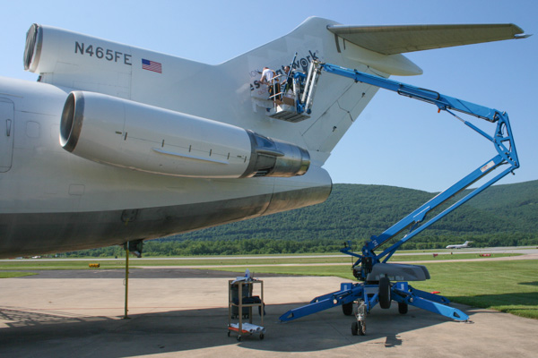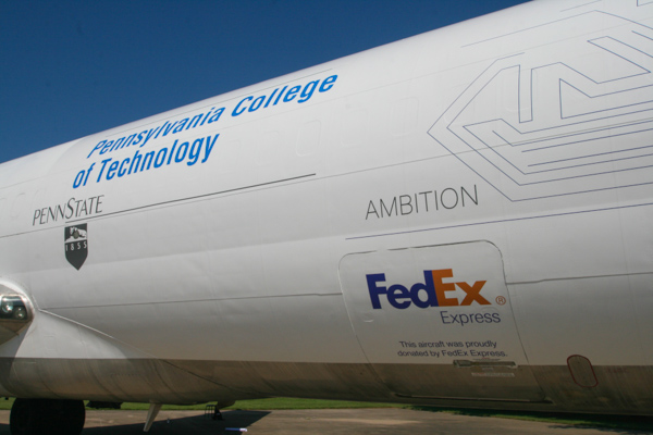 An impressive undertaking, befitting one of the largest donations in the institution's history, is nearing completion at the Lumley Aviation Center in Montoursville. As storm clouds gave way to resumption of the work this past week, patient artisans continued to wrap a donated Boeing 727 jet in a snug-fitting vinyl shroud. The plane's nose-to-tail makeover, as much protective as it is decorative, emblematically replicates the transformational benefit of a Penn College degree.