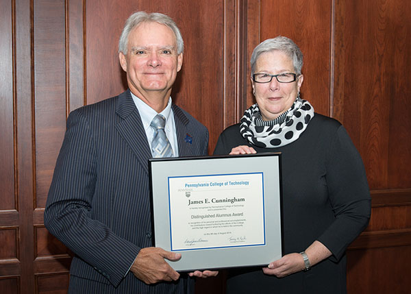 “Jim is certainly a dedicated alumnus and very deserving of this recognition, given his long history with Penn College and Williamsport Area Community College,” said Barry R. Stiger, vice president for institutional advancement. “His commitment to the college is evidenced by the establishment and continued support of the Cunningham Family Scholarship. Even in retirement, Jim remains actively involved with the Penn College Foundation Board of Directors and other college committees and activities.”