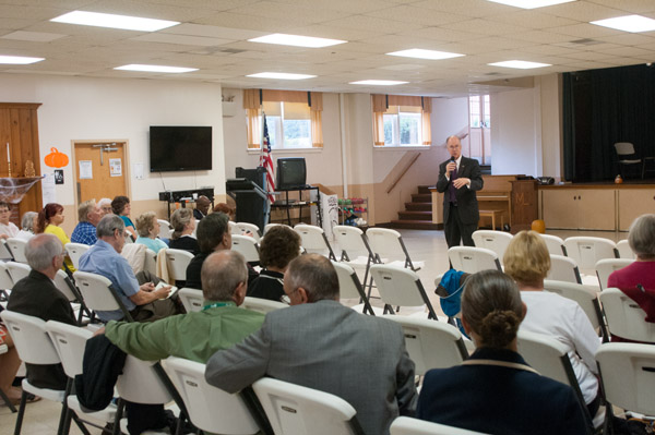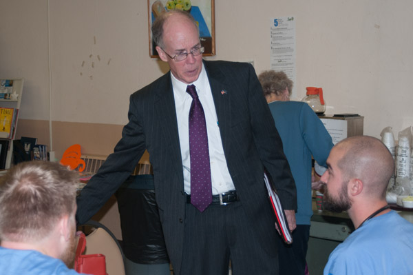 Four first-semester students in Penn College’s associate-degree RN preparation major visited Messiah Senior Community Center in South Williamsport on Tuesday to provide free health screenings. Also visiting the center was the state’s secretary of aging, Brian Duke, who spoke about initiatives for the state’s older population. The relationship between Penn College’s nursing program and the STEP Office of Aging – which manages the senior center – was established nearly 20 years ago by Jane J. Benedict, associate professor of nursing, when she developed health-screening clinics for students. “Today, we continue to bring small groups of first-year … students to area STEP senior centers for health-screening clinics during each fall semester,” said Laurie A. Minium, instructor of nursing. “Our partnership with STEP is invaluable: The students are able to strengthen newly acquired nursing skills, while at the same time, the area’s older adults have the opportunity to receive free blood pressure and blood-glucose screenings. During the clinics, students interact with the seniors, staff and volunteers at the centers – focusing on proper skill technique, communication and client teaching.”