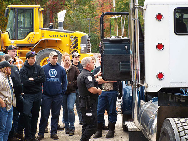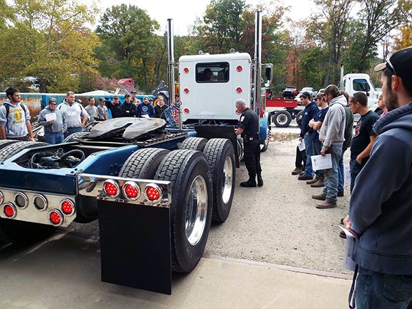 Pennsylvania State Police made their annual visit to Penn College's Schneebeli Earth Science Center recently to give students a front-line understanding of the laws and regulations governing commercial traffic on the commonwealth's highways. Trooper Cory Beaver, along with Motor Carrier Enforcement Officers Dave Kelch and Will Latchet, outlined the extent of responsibility and liability that a servicing technician holds in ensuring that the vehicles they maintain and repair are within guidelines. Diesel technology and heavy construction equipment technology: technician emphasis majors also witnessed an actual roadside commercial vehicle safety evaluation.Photos by Pamela A. Mix, secretary to the ESC executive director and assistant dean of transportation and natural resources technologies