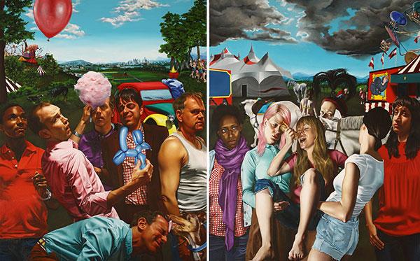“I am fascinated by storytelling,” writes Campbell. “Humans have created a complex set of symbols and signs, which fill every aspect of our lives with meaning. We tell ourselves and others stories every day in order to create and manage this meaning, and to interpret the world and our place in it. Human interaction is mediated by the use of symbolic language. To tell stories, we must assign meaning to symbols and we must constantly interpret them. In painting, these signs and symbols are uncertain. Without text to stabilize how images are to be interpreted, the meaning is indeterminate and fluid; the image is subject to multiple interpretations. … In my work, I am interested in the process of storytelling and how this transmission of meaning works. My work is a narrative of symbols.”Set in fictitious landscapes, Campbell’s vignettes involve characters from a range of society, playing various roles. Comedy and tragedy mingle with satire. In contrast, the landscape backdrops are harmonious and well-ordered.