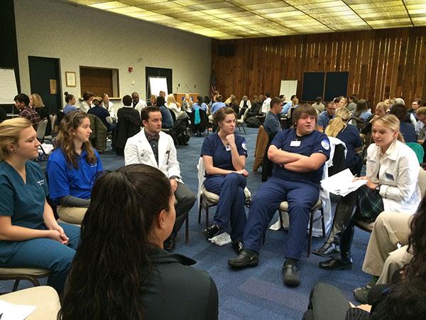 Students representing nearly all of the majors in the School of Health Sciences gathered in the Thompson Professional Development Center on Friday to learn from one another as they discussed their differing roles in a medical case. The "tabletop" Interdisciplinary Professional Event is designed to help Penn College students understand the perspectives and duties of others on a medical team in the interest of holistic treatment for their future patients. The school provides its students with a hands-on IPE in the spring, when actors simulate medical emergencies across campus.Photo by Kim A. Speicher, dental hygiene instructor