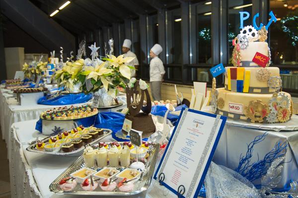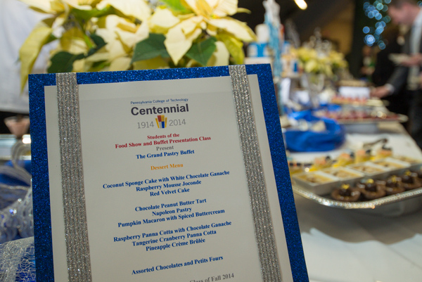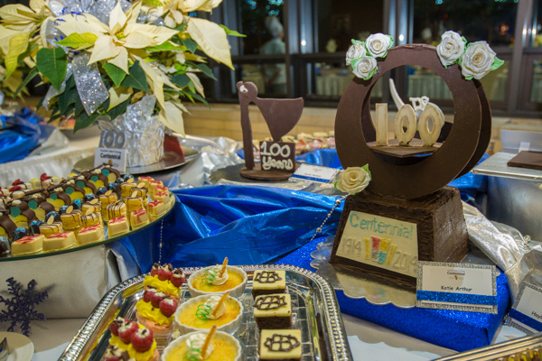 The Centennial logo tops the menu for The Grand Pastry Buffet, spotlighted at evening's end in the atrium area of KDR.