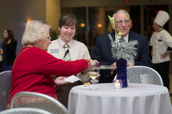 Giving and receiving with a smile are student Stephanie L. Johnson, Waterford, a hospitality management major, and guests Marie and William Knecht.