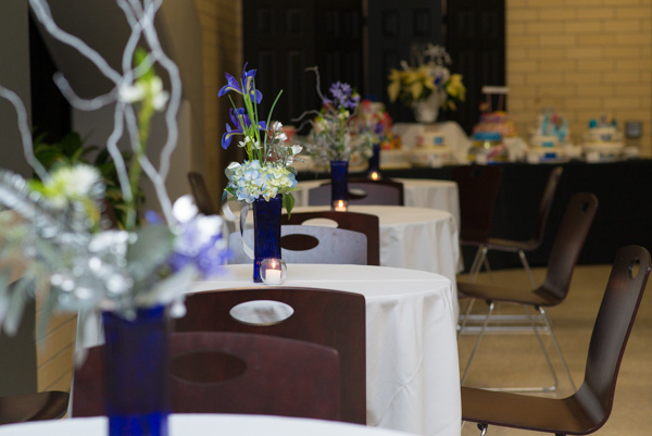 Individual mingling tables lead to a display of cakes commemorating the college's 100th anniversary.
