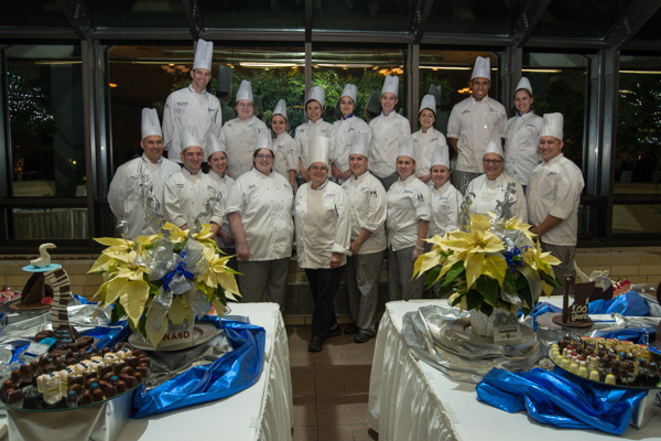 The baking and pastry arts team gathers with soon-to-retire faculty member Sue L. Mayer, assistant professor of baking and pastry arts/culinary arts, front-and-center. Among those joining their colleague are Todd M. Keeley and Chef Charles R. Niedermyer II (on left in first and second rows, respectively) and Chef Monica J. Lanczak (front row, second from right) – all instructors of baking and pastry arts/culinary arts.