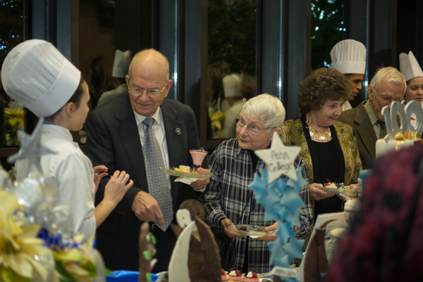 Carl and Lois Wolgemuth receive assistance from student Diana N. Lindner in navigating an array of delights. Lindner is a baking and pastry arts major from North White Plains, New York.