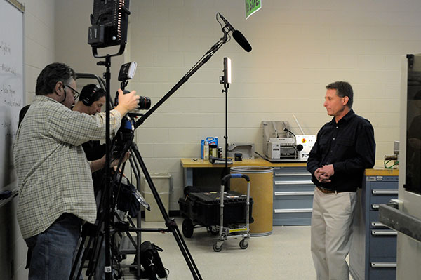 A production team from Harrisburg spent much of Tuesday in Penn College's plastics laboratories, preparing for a brief video that will be shown at NPE: The International Plastics Showcase from March 23-27 in Orlando, Fla. Gathering footage and conducting interviews for the Team Pennsylvania Pavilion in the Orange County Convention Center were Nell Abom, a communications consultant working with the state Department of Community and Economic Development, and Commonwealth Media Services' Mike Lomma, director of videography, and Dave Pinskey, audio engineer. The three-person crew toured labs in each of five featured processes (injection molding, extrusion, blow molding, rotational molding and thermoforming) and talked with students, faculty and Plastics Innovation & Resource Center Director C. Hank White about the hands-on education offered both on the curricular side and in helping the industry remain competitive. Penn College is one of only five colleges in the nation offering degree programs in plastics accredited by the Engineering Technology Accreditation Commission of ABET, and boasts unique National Centers of Excellence in rotational molding and thermoforming – distinctions that will be highlighted in the video, as well.