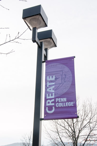 Just in time for this month's Spring Open House, new banners are rising alongside the roadways and walkways of Penn College – inspiration for visitors and affirmation for students and employees. Installation began Wednesday, as General Services crews lined the thoroughfares with bold colors and words that concisely summarize the varied activities afoot collegewide (interspersed with the more familiar sights of the institution's official seal and Wildcat logo).