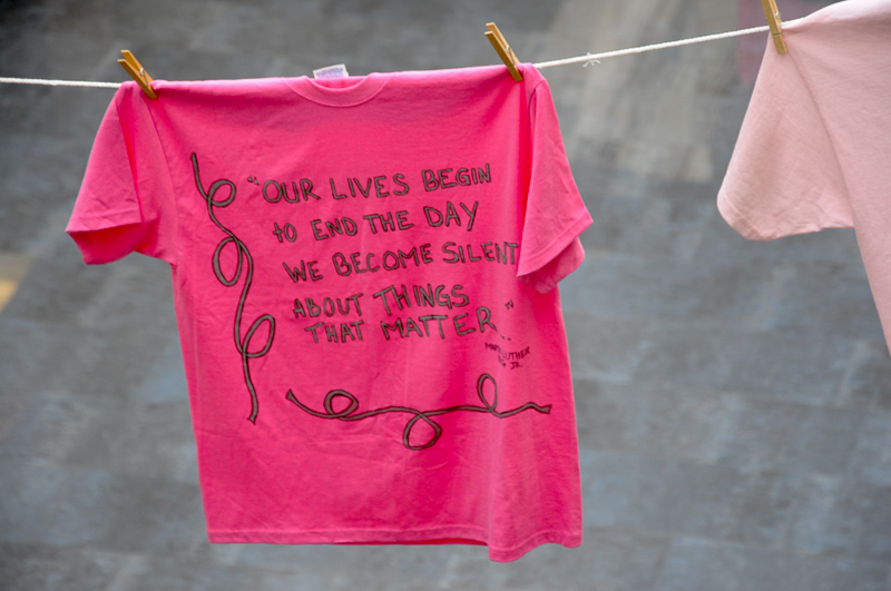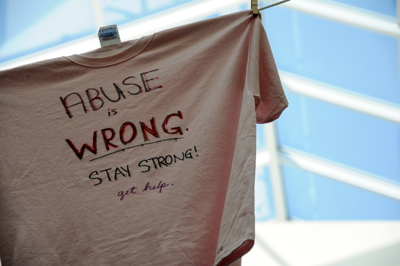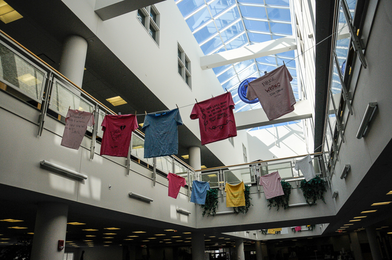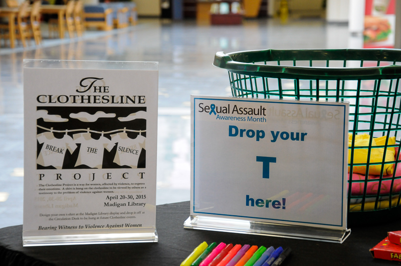 The Clothesline Project, a way for women affected by violence to express their emotions, has returned to Madigan Library through Thursday. T-shirts bearing testimony to the enduring problem, designed by survivors and their supporters, are pinned to the clothesline in hopes that their hanging will lead to healing.Photos by Caleb G. Schirmer, student photographer