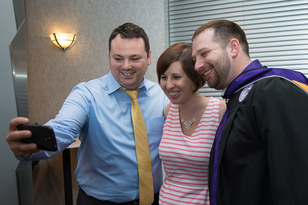 "Old" friends, fairly recent alumni all, take a selfie before commencement. From left are Adam J. Yoder, Sarah R. Shott and Brian D. Walton.
