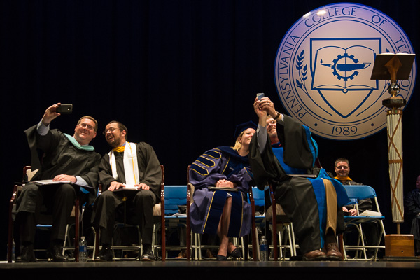 President Davie Jane Gilmour with her cell phone, inviting others to snap away and use #pctgrad when posting to social media. "After all, we are a college of technology!" she said.