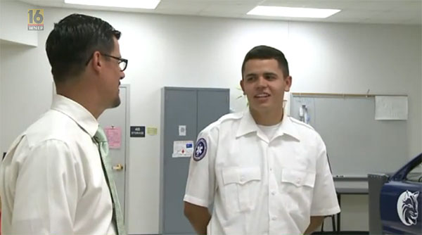 Newswatch 16’s Kristina Papa incorporated volunteers from Penn College's School of Health Sciences in her Tuesday report on preparations for the Little League Baseball World Series. The WNEP multimedia journalist recently interviewed Mark A. Trueman, director of paramedic technology programs; and emergency medical services and paramedic technician students Louis J. Mazzante IV, of Montoursville, and Adam N. Finkelstein-Diaz, of Stroudsburg. Series play begins in South Williamsport on Thursday, the day after the college hosts a cookout for the 16 bracketed teams before the Grand Slam Parade down West Fourth Street.