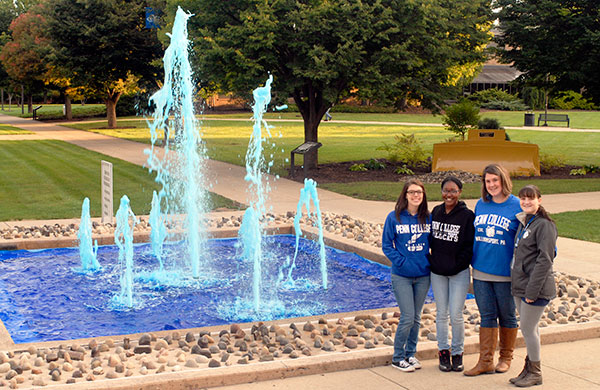 A pre-Homecoming tradition was renewed outside the Breuder Advanced Technology & Health Sciences Center shortly after sunrise Monday, as General Services and the Blue Crew tinted the Veterans' Fountain in advance of the week's activities. The officers and adviser of the Wildcat booster organization joined Charley A. Kern, director of facilities engineering for GS; John M. Chernego, environmental specialist; and Gary T. Pandolfi, refrigeration, heating and plumbing mechanic, in the third annual kickoff event.