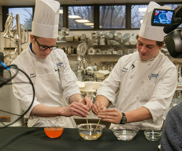 In their last class before finals, students in a new course, Introduction to the Modernist Kitchen, demonstrated tasty new methods for creating dishes, marrying traditional cooking preparations with science and technology. The culinologists’ products ranged from spaghetti noodles made from apple cider to orange-soda “caviar.” The course is taught by Chef Frank M. Suchwala, associate professor of hospitality management/culinary arts. Some of the processes will be shown at Penn College’s booth at the USA Science & Engineering Festival in Washington, D.C., in April.