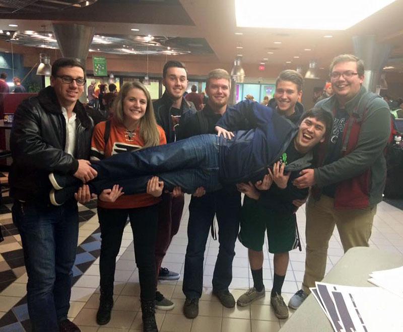 "Dan's Team because the real name changes every week" was the top finisher in Campus Quizzo for the fall semester, turning in the best overall performance from more than a dozen weekly competitions. Pictured holding Daniel T. Kreger, of Morris, a building science and sustainable design: architectural technology concentration major, are (from left) James S. Alger, Campbelltown, aviation maintenance technology; Kristen E. Bowes, Wayne, Web and interactive media; Jared A. Fasshauer, Beach Lake, building science and sustainable design: architectural technology concentration; Eric J. Daniels, Beach Lake, civil engineering technology; Carson J. Klikus, Beach Lake, renewable energy technologies; and Isaac A. Reber, Selinsgrove, civil engineering technology. "The Other Guys" finished second; third-place honors went to "Jake From State Farm." Teams of up to eight students – encouraged to create a team name and use the same one from week to week! – are invited to join the fun when Jon Mackey's "Campus Quizzo" returns to CC Commons at 7 p.m. Thursdays during the Spring 2016 semester.Photo provided