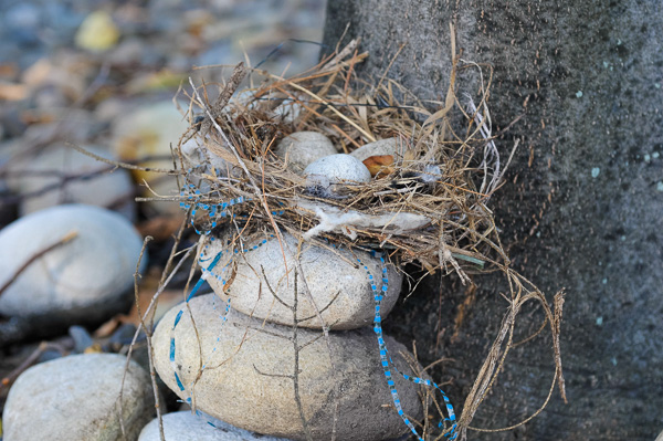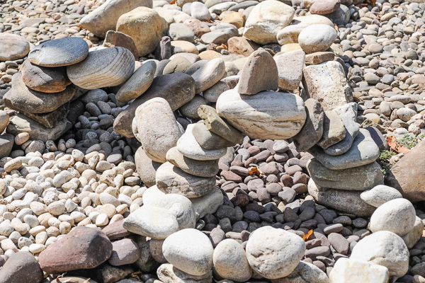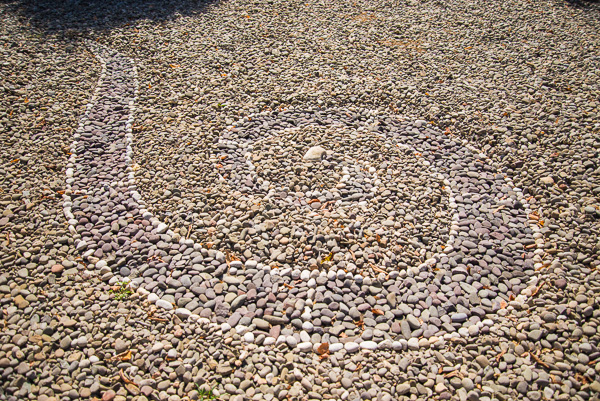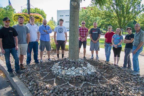 As an icebreaker exercise to launch the fall semester, David A. Stabley, instructor of ceramics/wood sculpture, led students in his ART 142 wood sculpture class through an exploration of the environmental art created by famed British sculptor Andy Goldsworthy. The students then moved out of their Bush Campus Center lab and into nearby landscaping areas, and, in pairs, created their own environmental art pieces using stones and other found objects. “I wanted them to start thinking outside the box,” Stabley said. “The weather was nice, and so many people who were walking by commented on the project and asked questions like ‘What class is this?’ – it all became part of the process.” While ultimately temporary artwork, the small project continues the tradition of artistic exploration and artwork around campus.Third and fifth photos by Grace F. Clark, student photographer