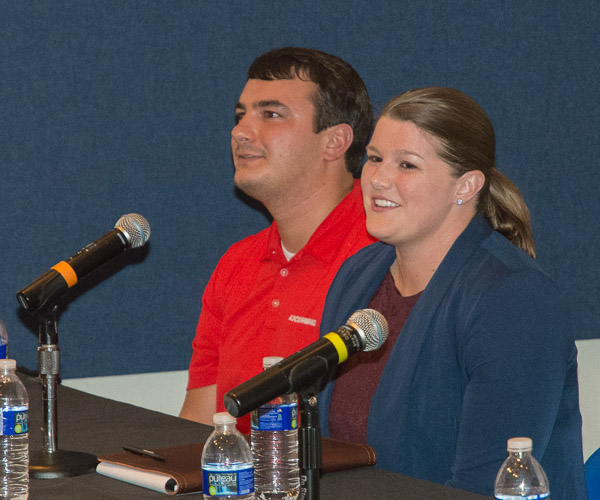 A group of business professionals – including four alumni – attended a recent mixer with students in Penn College’s business majors. In addition to chatting over hors d’oeuvre, the pros offered a panel talk in the Student and Administrative Services Center Presentation Room. They offered lessons they’ve learned in navigating their careers and advised students on such practical tips as submitting resumes, networking, and managing work-related stress. Panelists were Ryan M. Enders, ’13, technology management, and ’11, aviation technology, who is a field service representative for Lycoming Engines; Tracy L. Schroeder, ’13, business administration: banking and finance concentration, who is program coordinator for InCourage Financial Wellness; Lisa M. Andrus, part-time instructor of business administration/management/marketing and owner of Andrus Hospitality; Samuel Ryder, vice president-group manager for Fulton Financial Corp./FNB Bank; Scott D. Rinker, ’12, business administration: marketing concentration, who is a branch manager for Jersey Shore State Bank; and Anthony J. Peachey, ’09, business administration: marketing concentration, who is product manager for Construction Specialties Inc. and holds LEED Green Associate certification.
