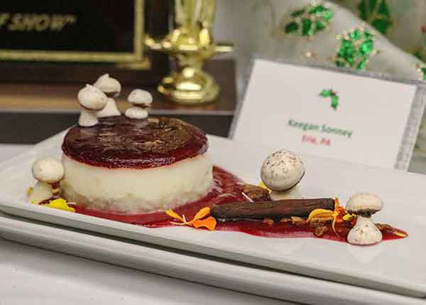 The Chef Eugene Mattucci Best of Show Award was granted to Keegan D. Sonney, a baking and pastry arts student from Erie, for a festive “Flan in the Forest” plated dessert. The eye-catching plate comprised RumChata flan topped with cranberry gelee and served with a chocolate stick, shortbread cookie crumbles, cranberry-mint sauce, mushrooms and edible flowers.