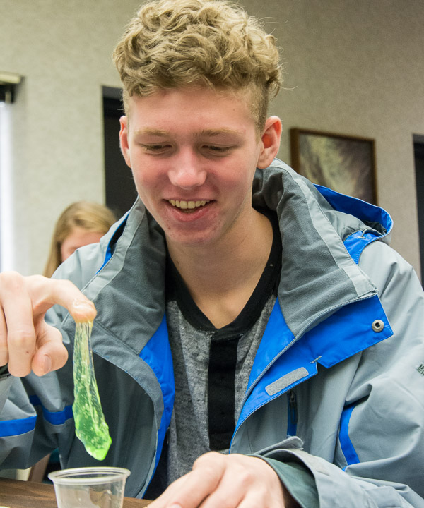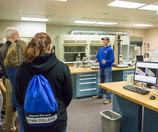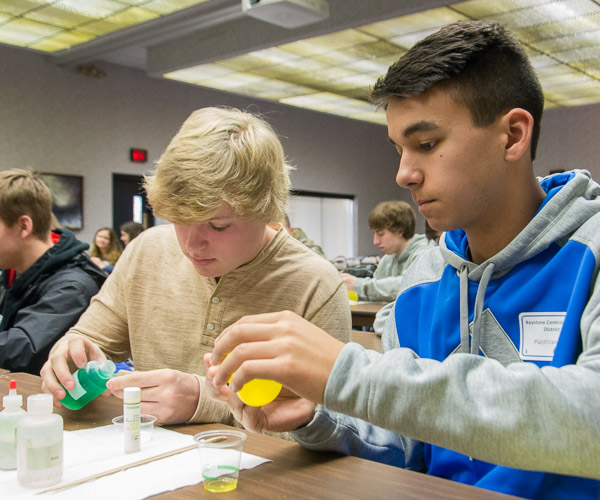 Seventy Keystone Central School District chemistry students converged on Penn College on Tuesday to learn how their chemistry lessons apply to the field of plastics. During a four-hour stay on campus, they took part in a variety of plastics experiments courtesy of the Society of Plastics Engineers’ PlastiVan program. Under the instruction of SPE Foundation Director Eve Vitale, the students learned about the chemistry of plastics and future career options while they made several polymers of their own. The PlastiVan’s visit was sponsored by Sekisui SPI, of Bloomsburg. The program travels to schools and companies throughout North America, educating people of all ages about the chemistry, history, processing, manufacturing, sustainability and application of plastics, all through hands-on experiences that spark scientific curiosity. In addition, the Keystone Central students took student-led tours of the college’s plastics and polymer laboratories and of the campus. More than half of the students in attendance are enrolled in Penn College’s Fundamentals of Chemistry course, taught during the school day by Keystone Central instructors through the Penn College NOW dual-enrollment program.