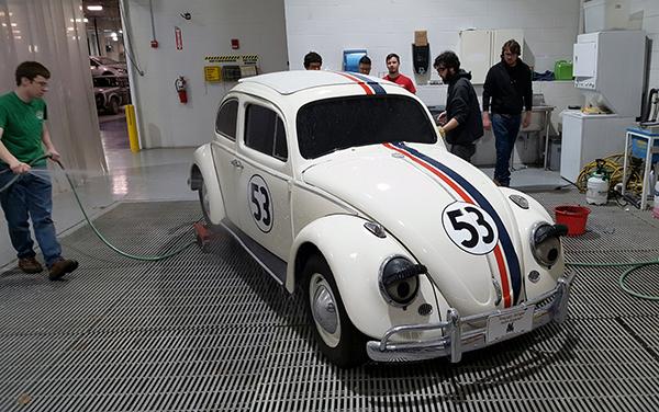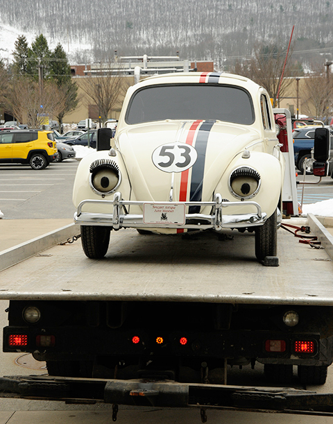 "Herbie, the Love Bug," the iconic Volkswagen Beetle, will be on display in Penn College's Madigan Library through the end of the semester. The car, used in "Disney on Ice" performances, is on loan from the William E. Swigart Jr. Automobile Museum in Huntingdon, among the supportive partners in the college's automotive restoration technology major. Herbie, complete with expressive eyelashes and a hood that opens to reveal teeth and a tongue, was installed in the library to encourage literacy.