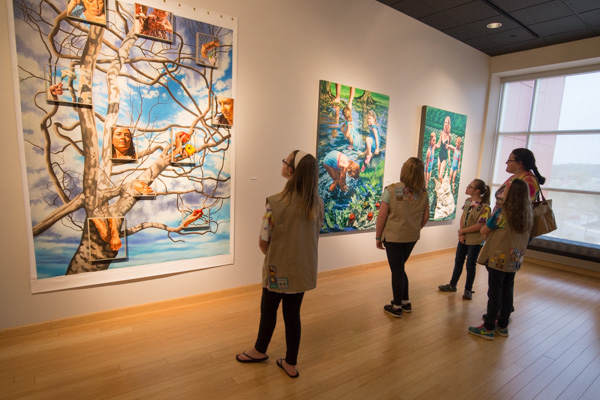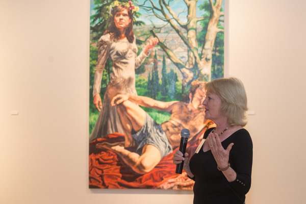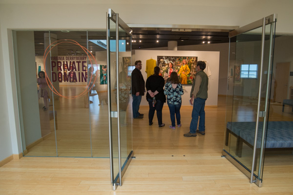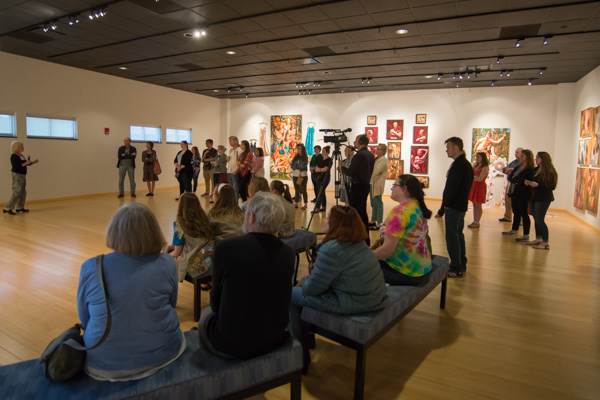 A sizeable crowd turned out in The Gallery at Penn College on Thursday evening for a closing reception for “Private Domain,” an exhibit of richly hued, large-scale photorealistic paintings by Virginia Derryberry, a recently retired professor of painting and drawing at the University of North Carolina at Asheville. The artist mingled with guests during the reception and delivered a gallery talk focused on her process and the concept of alchemy in her works. The exhibit was on display March 14 through April 20. During her two-day stay on campus, Derryberry shared her expertise with students enrolled in Modern Art and the Contemporary Image (ART 330), taught by Nicholas L. Stephenson, instructor of graphic design. She also toured the art studios in the Bush Campus Center and dined in Le Jeune Chef Restaurant.