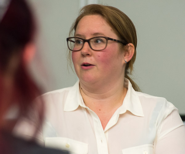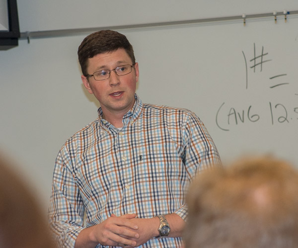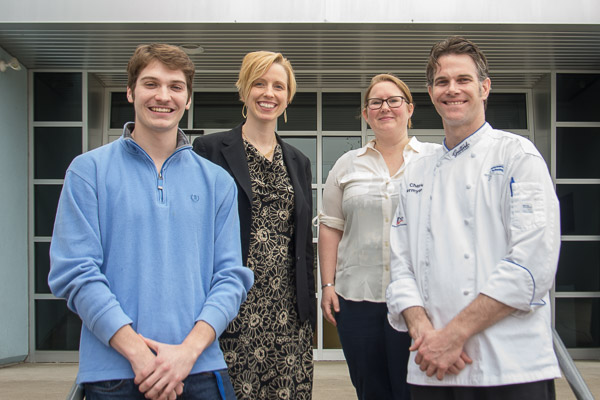 Dylan H. Therrien, a culinary arts and systems student from Reading, learned during a visit to campus by Kate Hunter, a 2000 graduate of the college’s culinary arts technology and food and hospitality management majors, that he will receive the Jones Dairy Farm Culinary Scholarship for 2017-18. Jones Dairy Farm, a six-generation family-owned leader in breakfast sausage, established the scholarship for Penn College students in 2015. Hunter is a manager for Peak Sales & Marketing, a broker for Jones Dairy Farm products. In addition to presenting congratulations to Therrien, Hunter brought a lesson in calculating yields, using bacon from Jones Dairy Farm that was cooked and tested by students in Chef Paul Mach’s Classical Cuisines of the World course. The students calculated how much bacon and fat remained after cooking and the resulting per-slice and per-ounce cost of the cooked product. Joining Hunter was Chris Eckard, of Anchor Food Professionals, who added further insight related to dairy products, such as cream and butter. Critically evaluating cost vs. quality among competing products will serve students well in working kitchens, Mach explained.