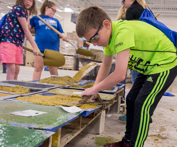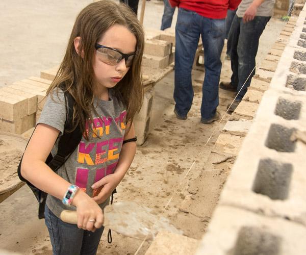 A group of more than 35 youngsters gathered in the Construction Masonry Building on Thursday for Penn College’s celebration of Take Our Daughters and Sons to Work Day. Before spending the afternoon shadowing their parents, the children learned about careers in masonry, courtesy of the School of Construction & Design Technologies. With help from a legion of students, faculty members Glenn R. Luse, instructor of construction masonry, and Franklin H. Reber, instructor of building construction technology, taught the visitors to make colored concrete stepping stones, lay a straight and sturdy wall of brick, artistically apply stone to a wall, and construct gravity-defying brick archways. Following cleanup and the distribution of certificates in the CMB by dean of construction and design technologies Marc E. Bridgens, student ambassadors led the group on a tour of campus before they headed to lunch in the Capitol Eatery. The event is sponsored by the President’s Office and Human Resources.
