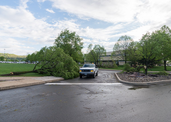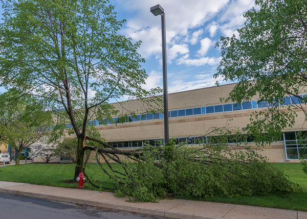 A powerful storm that brought 65-mph winds and a tornado threat to Lycoming County on Monday toppled trees and caused service outages at Penn College – but, thankfully, there were no reports of injuries. General Services crews were dispatched even as the rain persisted, continuing with storm cleanup well past daybreak. College Police, too, tended to the aftermath on multiple fronts, and Information Technology Services burned the midnight oil to restore Internet and email access.
