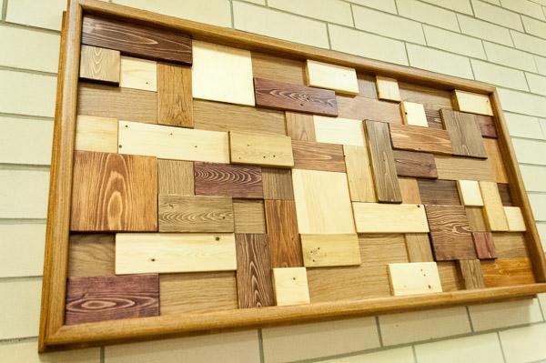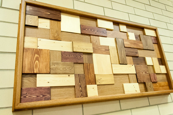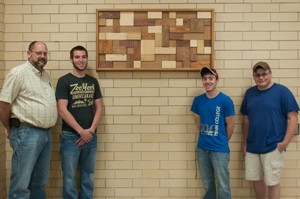 Five students in Peter Kruppenbacher’s Woodworking – Art, Craft and Design course brought the vision of Dining Services Director Crissy L. McGinness to life this semester when they completed a piece of wood wall art for the Keystone Dining Room. McGinness has been working with students from various corners of campus to produce artwork for the college’s dining areas, letting their craftsmanship – and the materials of their fields – add a touch of true Penn College character to the eateries. The latest installment was inspired by photos that McGinness sent to Kruppenbacher. The finished piece includes Pennsylvania wood products: pine, spruce, oak, cherry and walnut. The frame is made of poplar. The bulk of the work was completed by Tyler M. Arthur, a manufacturing engineering technology student from Fleetwood; Liam M. McCay, an applied technology studies student from Bloomsburg; and residential construction technology and management students Nicholas D. Gieger, of Dingmans Ferry, Zachary J. Ridall, of Berwick; and Aaron F. White, of Westover. Woodworking – Art, Craft and Design (CCM 140) is an applied arts elective available to students in any major.