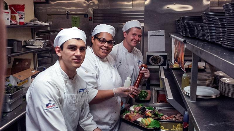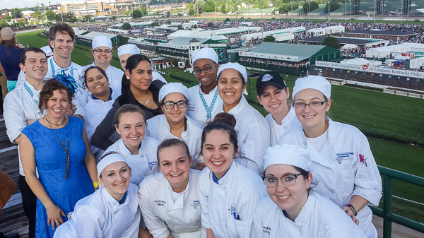 Students were stationed in the Churchill Downs main kitchen, which handles some of the biggest projects on the property, and in high-end venues throughout the facility. In the main kitchen, they helped to prepare 4,000 bourbon caramel s’mores, 1,200 Guittard chocolate verrines, 3,000 assorted dessert tarts, over 6,000 pounds of roasted New York strip steaks, 1,500 seared chicken breasts and six pallets of roasted baby carrots – among other duties.