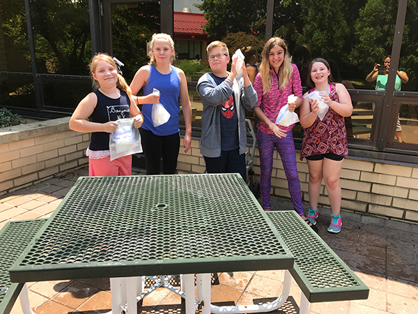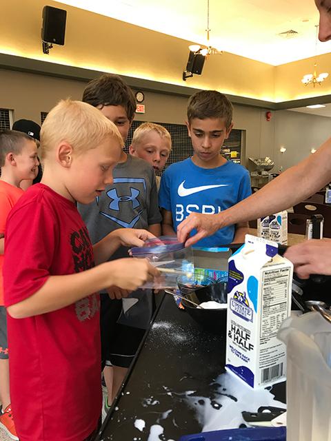 Enjoying an appropriate treat on a muggy Monday − one day after National Ice Cream Day − youngsters in Penn College's Camp ESCAPE made ice cream in the Keystone Dining Room. Temperatures neared 90 as Week Six of the summer camp began, a situation made much more tolerable with the help of Rebecca L. Pawlik, Dining Services' registered dietitian, and Andrea N. Breon, the dining unit's head cook.Photos by Amy S. Lingg, Dining Services marketing assistant