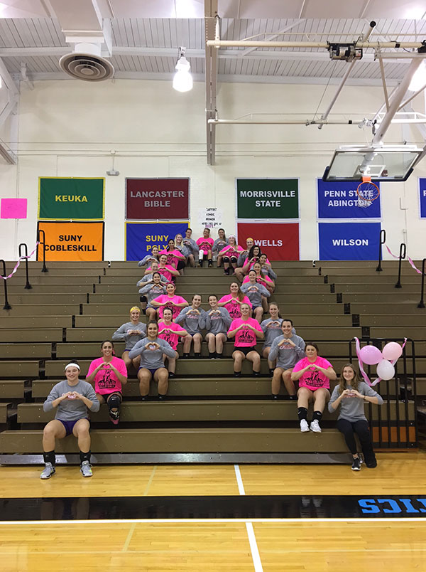 The Penn College women's volleyball team, as well as its Elmira College opponents in Tuesday's match, joined in a Bardo Gymnasium observance of the annual “Pink Out” for Breast Cancer Awareness Month. "Each of our ladies played in honor of someone who has been diagnosed with breast cancer at some point – several are still fighting the fight, some have overcome," said coach Bambi A. Hawkins, learning laboratory coordinator for the college's paramedic program (who also provided the photo). "It was fabulous to have the Elmira team join right in and coordinate with our ladies to create the largest ribbon they could."