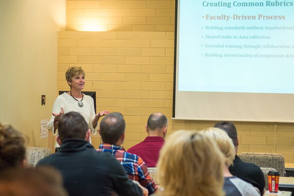 A half-day Assessment Academy was held in the Bush Campus Center on Friday, focusing on a new core educational curriculum and effective ways to assess student progress in key areas of learning that include critical thinking, communication skills, and analytical and scientific literacy. Joanna K. Flynn, associate professor of mathematics and chair of the Core Curriculum Implementation Committee, began the sessions with an overview of the framework and goals of the new core curriculum. Mary Jo Saxe, associate professor of dental hygiene and chair of Penn College's Quality Through Assessment Committee, followed with a discussion about assessment of general education and the integration of core goals and their appraisal within students’ majors. Justin M. Ingram, assistant professor of biology and head of the Science Department, led a conversation about practical ways to develop common evaluation tools, and Christopher H. Van Stavoren, assistant professor in automotive, presented a practical assessment example of a technical skill in an automotive course, with suggestions about best practices that apply in other fields.