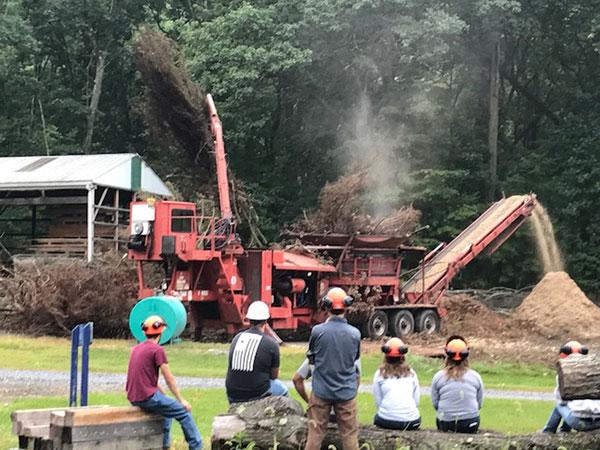 In a mutually beneficial service project, the Penn College Forestry Club removed approximately 45 trees from the White Deer Golf Course entrance and hauled them across Allenwood Camp Lane to the college's Schneebeli Earth Science Center. The trees were stacked in a pile for summer storage at the campus – home to many of the majors in the School of Transportation & Natural Resources Technologies – then, last month, the Lycoming County Landfill sent over its tub grinder for chipping and grinding of the material. The mulch will be used on the ESC's trail system and for various recreational projects throughout the academic year.Photo provided
