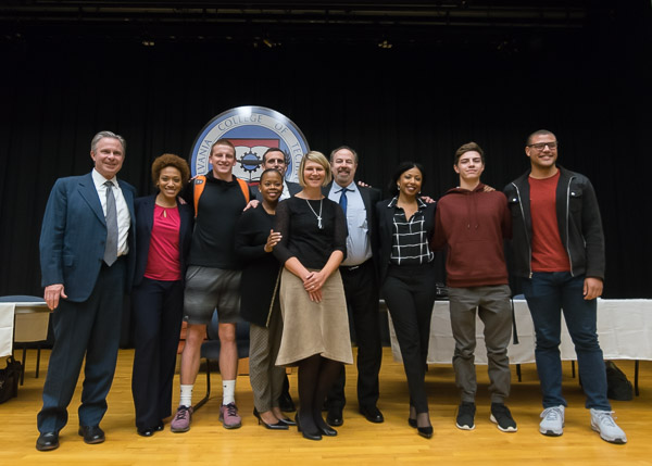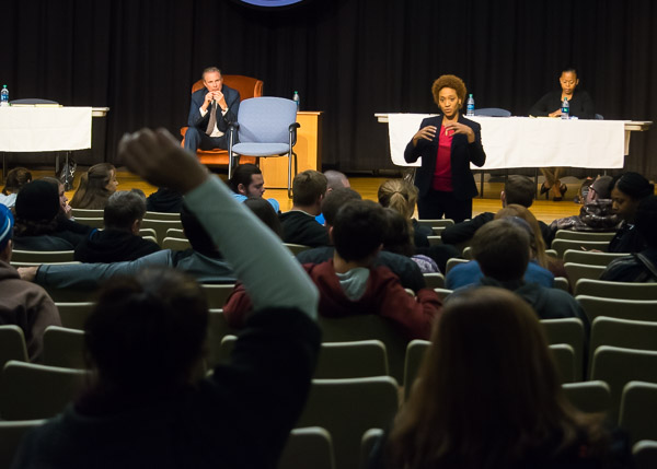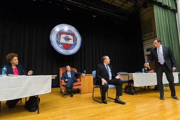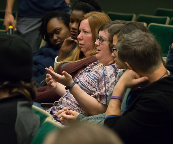 "The Defamation Experience," an interactive diversity program, brought its provocative and timely message to Penn College this past week. The theatrical presentation, held in the Klump Academic Center Auditorium, comprises a civil-court drama that explores the highly charged issues of race, religion, gender, class and the law; deliberations with audience members as jurors; and an after-show discussion that respectfully challenges preconceptions. "In collaboration with our coordinator of diversity and cultural life and our Community Peer Educators, our office of Campus & Community Engagement strives to promote, create and sustain an inclusive campus environment," director Katie L. Mackey said. "One of the ways we strive to work toward our mission is through educational initiatives such as this riveting program. We greatly appreciate the support of our co-sponsor, Paul Watson, the dean of academic services and college transitions, and the First Year Experience instructors who encouraged students to attend."Photos by Tia G. La, student photographer