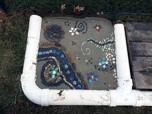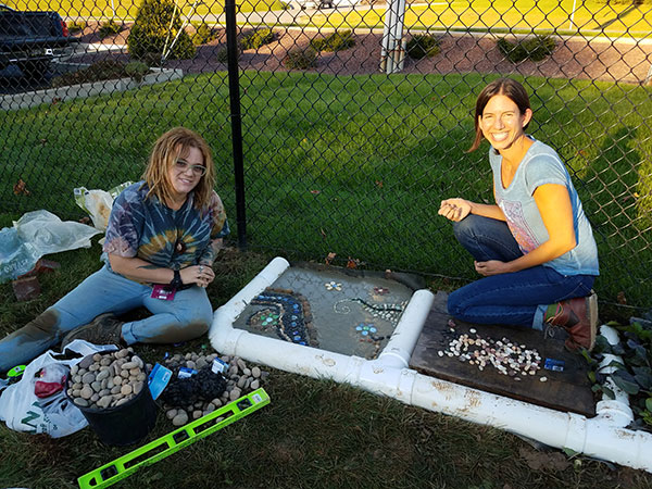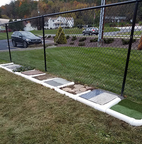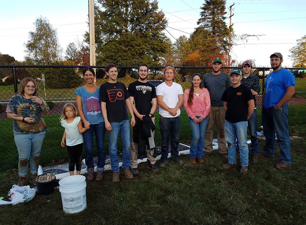 Penn College's Horticulture Club has created a sensory path for STEP Inc.’s Early Head Start program on Four Mile Drive in Williamsport. The path comprises several squares with materials to engage the senses of those who touch them. The path features nine distinct textures: a stone mosaic, composite decking, bricks, flagstone, logs, artificial turf, smooth granite, mountain stone with sedums, and ajuga. Club members used PVC pipe to separate the sections so that the children can add paint to it. From left in the group photo are landscape/horticulture technology majors Katherine L. Kahn, Williamsport; Breanne R. Goldsmith and daughter, Liberty; Michael D. Ludwig, Glenside; Benjamin A. Mowrer, Manheim; Quinn R. Loudy, Middleburg; Laura J. La Grave, Lewisburg; Griffin T. Fulton, Mertztown; Bryce P. Thompson, Enola; Mark C. Ludwig, Glenside; and Kyle J. Schatz, St. Marys. (Also helping, but not pictured, were Adriana S. Lee, Williamsport; Kendall A. Wanner, Denver; Jacob R. Courtley, Ardara; and Janelle G. Kramer, Minersville.)Photos by Carl J. Bower Jr., assistant professor of horticulture